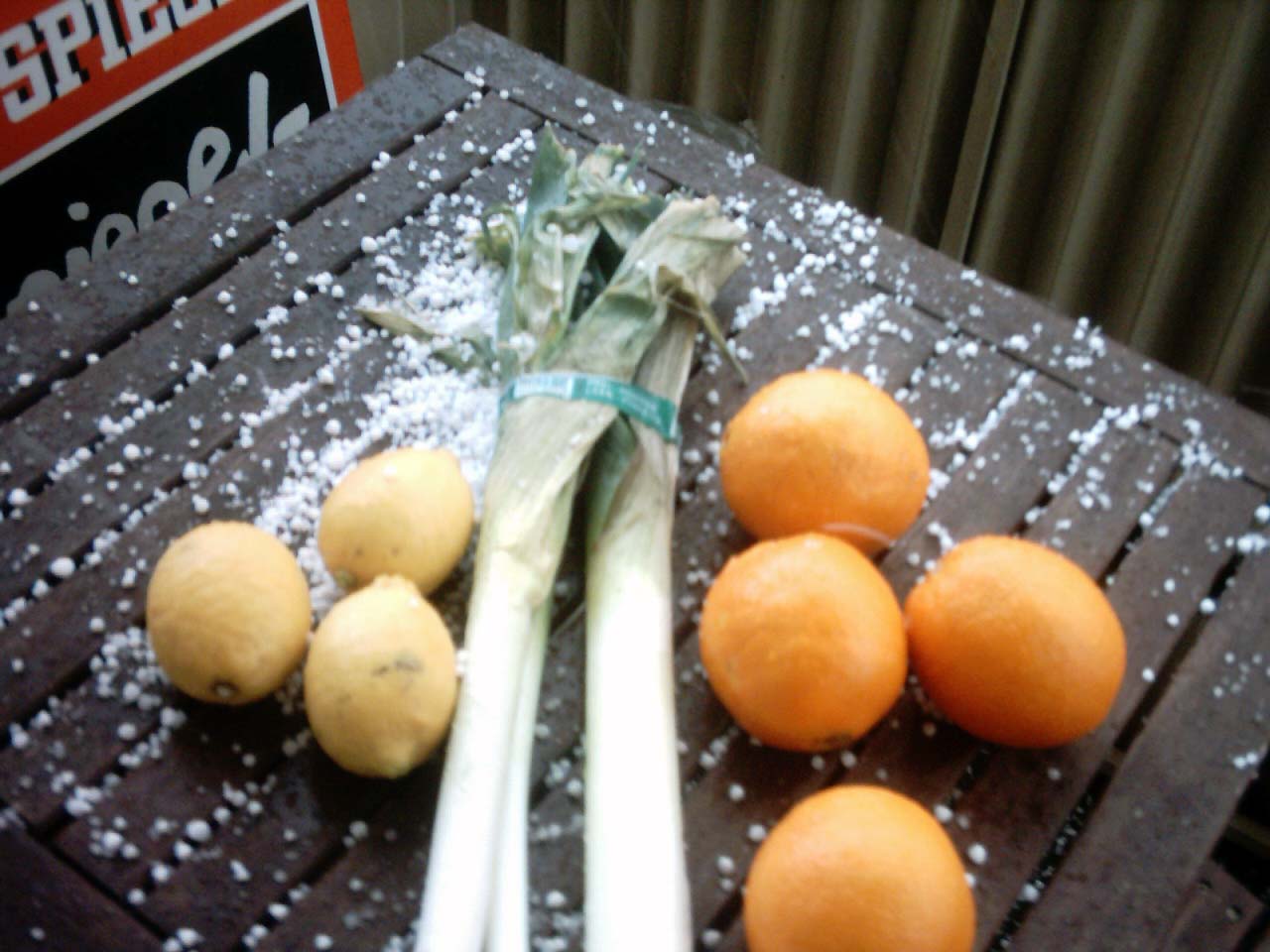 Fotos von dem Obst und Gemüse gemacht das auf dem Tisch auf dem Balkon liegt. Zitronen, Orangen, Porrée. Zwischendurch (plötzlich) Hagel (ich wollte gerade das Stövchen anzünden um den starken schwarzen Tee warm zu halten). Hat auf das Obst und Gemüse gehagelt. Einmal Blitz und Donner.