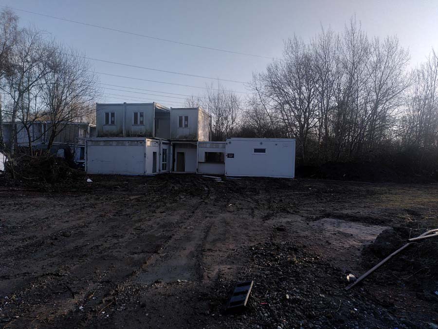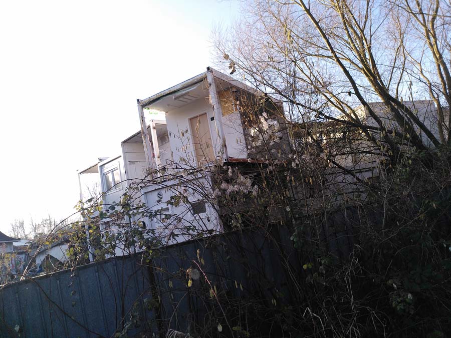wir bauen an unserem schönsten dystopia im verlorenen land zwischen müllverbrennung und moor. die punks sind fort und mittlerweile auch der eine hoffnungsvolle bauwagen, der stehen geblieben war. an seiner stelle stapeln sich nun zweistöckig ausrangierte wohncontainer. an einem steht „container 1 2300 c“, an einem anderen „not an entry“. einige paare schuhe sind in den zweigen der bäume hängen geblieben und einige dämonen wohl auch. neue sind hinzugekommen, davon ist auszugehen